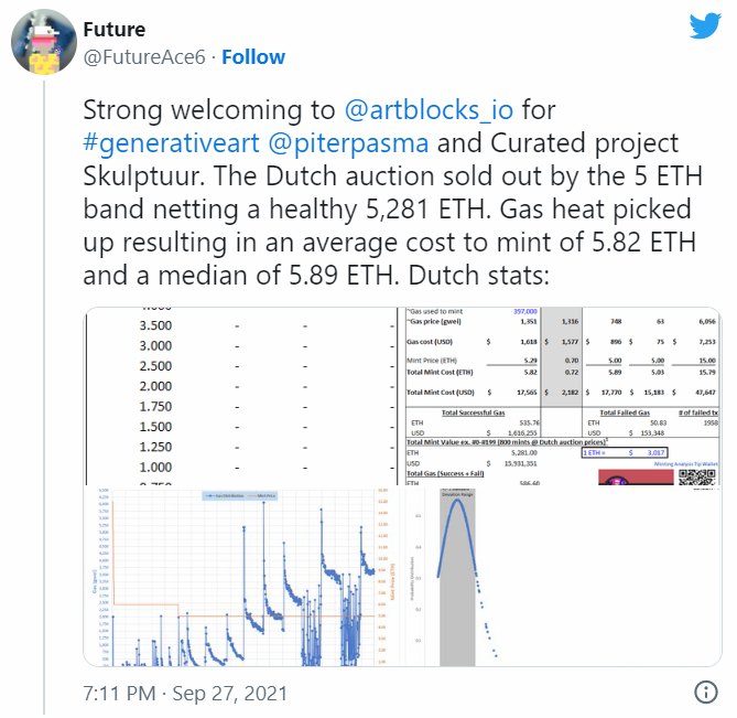 «Приветствуем проект Skulptuur. Цена на голландском аукционе не опускалась ниже 5 ETH, а совокупная выручка составила 5 281 ETH». Источник