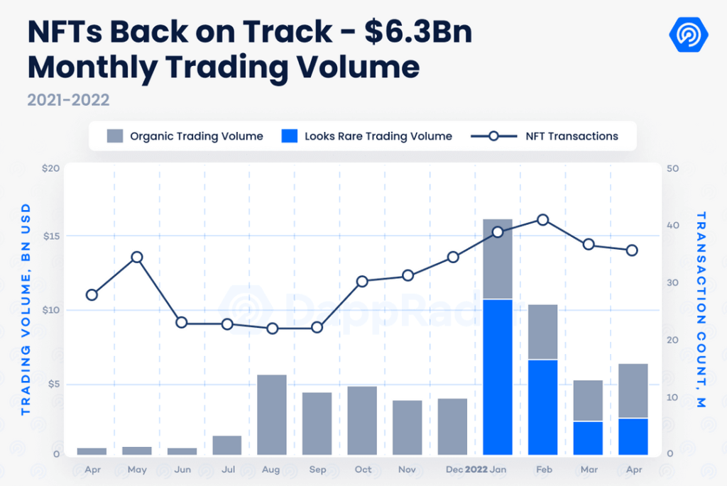 В апреле органический объем торгов невзаимозаменяемыми токенами вырос на 45% по сравнению с мартом, свидетельствуют данные поставщика аналитической информации DappRadar.