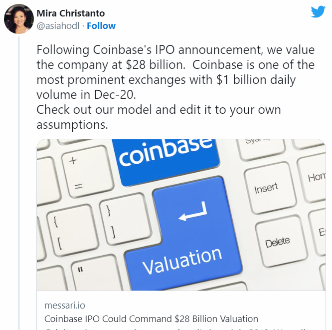«После объявления Coinbase о намерении провести IPO мы изменили модель оценки и считаем, что компания стоит $28 млрд. Coinbase — это одна из самых известных криптобирж с ежедневным объемом торгов в $1 млрд». Источник