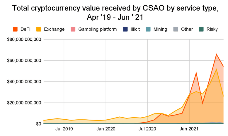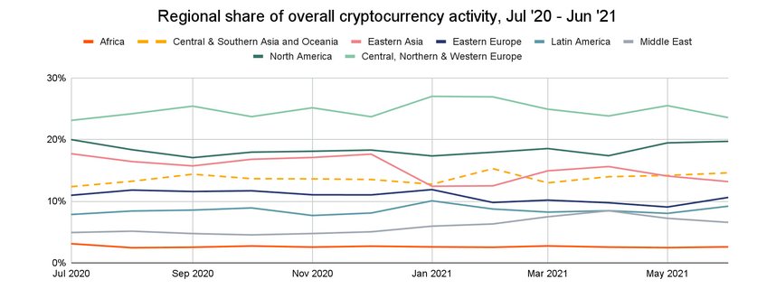 Согласно данным отчета Chainalysis, район Центральной и Южной Азии и Океании (CSAO) стал одним из самых быстрорастущих регионов в плане принятия криптовалют. Объем криптовалютных транзакций в период с июля 2020 года по июнь 2021 на данном рынке вырос на 706%, а общая сумма транзакций составила $572.5 млрд, или 14% от совокупного объема рынка.
