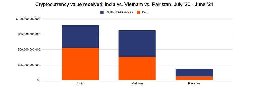 По данным Chainalysis, Индия стала лидером внедрения DeFi в данном регионе, однако ключевыми для CSAO также являются Пакистан и Вьетнам.