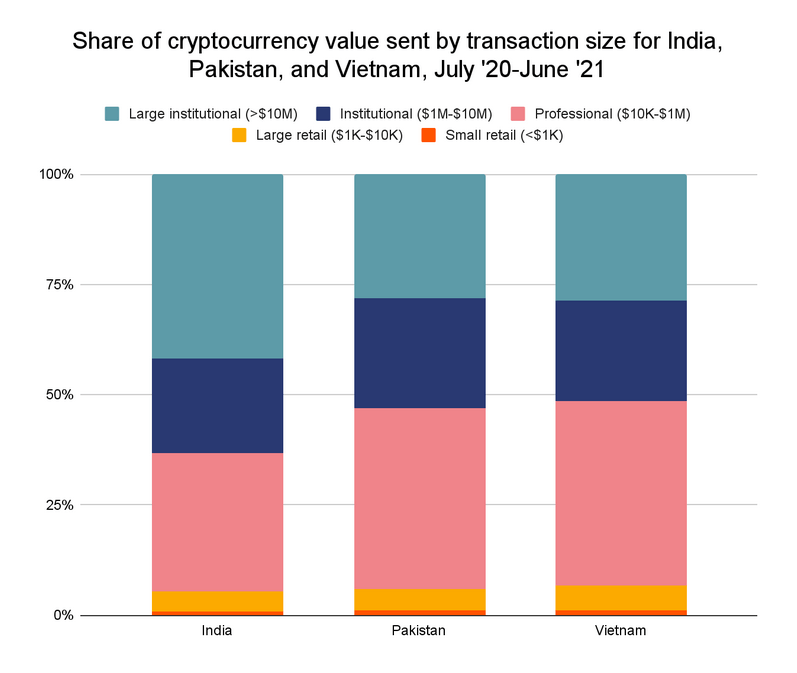 Chainalysis сообщает, что объем криптовалютных переводов размером более $10 млн составляет 42% всех транзакций, совершенных с адресов в Индии, по сравнению с 28% для Пакистана и 29% для Вьетнама.