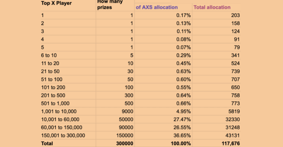 В то же время команда игры увеличила награды лидеров. Теперь 300 000 лучших игроков смогут выиграть AXS, а раньше вознаграждение давали только первой 1 000. Сумма награды также была увеличена до 117 676 AXS.
