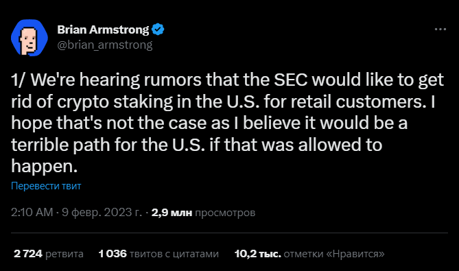 • По информации CEO Coinbase, SEC думает запретить стейкинг.