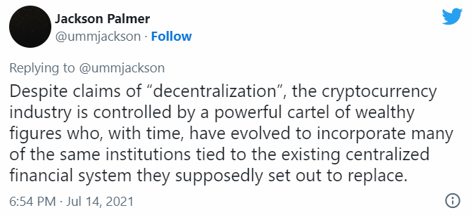 • По словам Джексона Палмера, криптоиндустрия управляется группой богатых людей и продажных СМИ.
