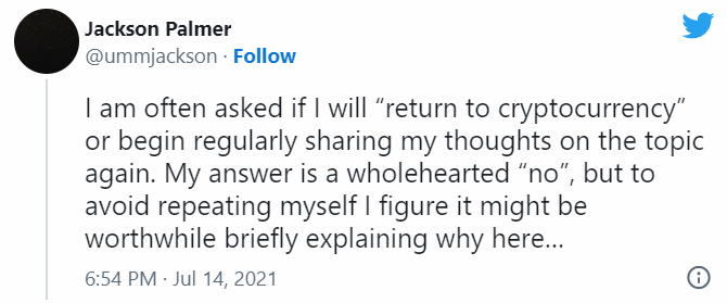 У создателя Dogecoin Джексона Палмера спросили, собирается ли он когда-нибудь возвращаться на крипторынок. В ответ он опубликовал серию постов в Twitter, в которых подверг жесткой критике всю криптовалютную индустрию.