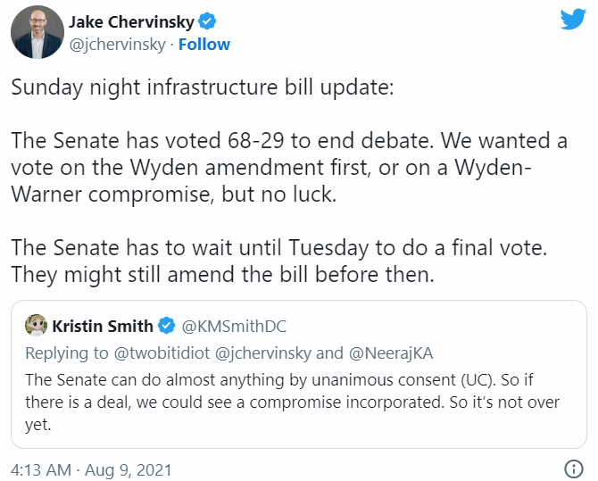 В Сенате США на данный момент находятся две редакции инфраструктурного законопроекта, который решает ряд текущих вопросов. Власти Америки намерены потратить более триллиона долларов на развитие инфраструктуры в стране, и криптовалюты стали одним из способов привлечения средств.