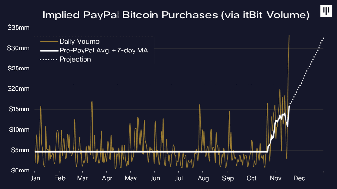 Предполагаемый объем покупок BTC пользователями PayPal. Источник