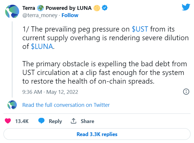 «Давление на UST из-за его огромной эмиссии приводит к сильной инфляции LUNA. Основным препятствием является исключение безнадежных долгов из обращения UST в достаточно быстром темпе, чтобы система могла восстановить работоспособность спредов».