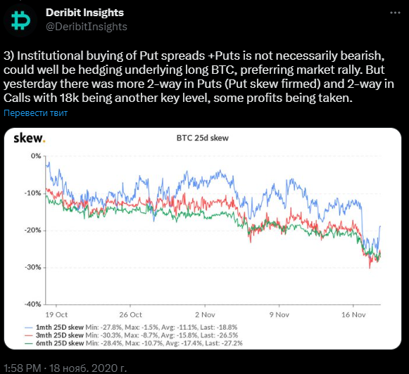 «Покупка пут-опционов институциональными инвесторами не обязательно является медвежьим сигналом. Вполне вероятно, что они хеджируют лежащие в их основе длинные позиции на биткоин. Но вчера действительно преобладал спрос на путы. При этом на отметках $18 000 некоторые зафиксировали свою прибыль». Источник