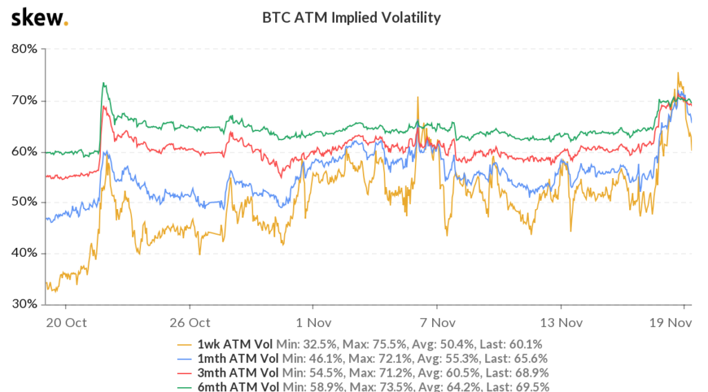 Месячная предполагаемая волатильность за последние 2 дня подскочила с 55% до 70.5% — это четырехмесячный максимум. Данные события сигнализируют о возможности повышенной турбулентности на крипторынке в течение следующих четырех недель.