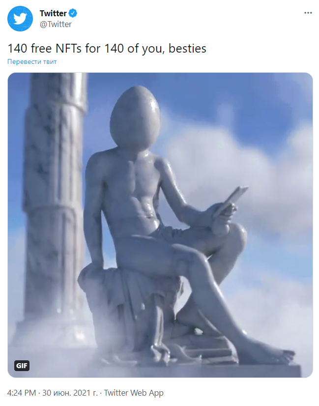 NFT от Twitter представляют собой анимированные изображения, связанные с социальной сетью. Всего было выпущено 7 разных NFT по 20 экземпляров каждый. Например, вот один из них: