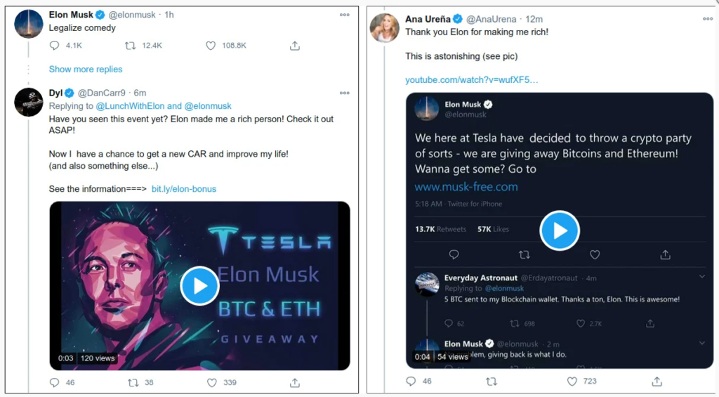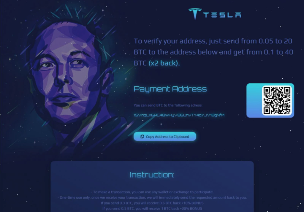 Хотя чаще всего используется имя Илона Маска, встречаются и другие, например, недавно рекламировали поддельную раздачу криптовалюты от имени сооснователя Gemini Тайлера Уинклвосса.