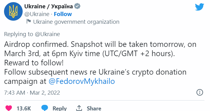 «Аирдроп подтвержден. Снимок будет сделан завтра, 3 марта, в 18:00 по киевскому времени (19:00 МСК). Следите за новостями о кампании по сбору пожертвований на официальном аккаунте министра цифровой трансформации Украины Михаила Федорова».
