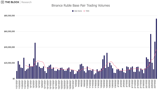 • Средний объем торгов в парах с российским рублем на Binance вырос с $11 млн до $35.8 млн.