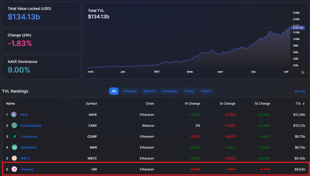 Тем временем объем заблокированных средств (TVL) на Uniswap составляет уже более $8.5 млрд. Биржа занимает шестую строчку по этому показателю среди всех протоколов из экосистемы DeFi. А TVL всего сектора DeFi насчитывает $134 млрд.