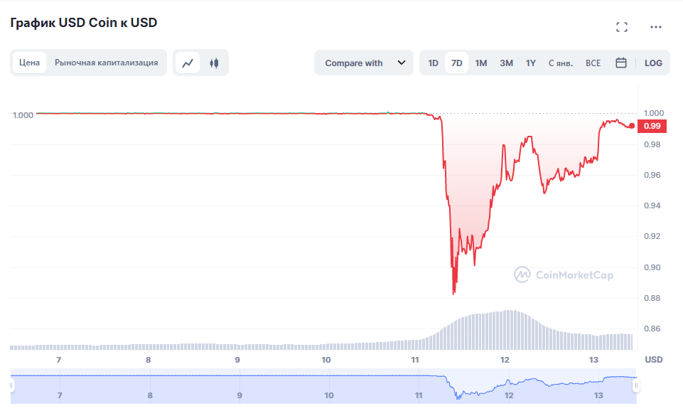 • На выходных USDC падал ниже $0.9 на фоне проблем с банком Silicon Valley, в котором Circle хранила обеспечение стейблкоина на $3.3 млрд.