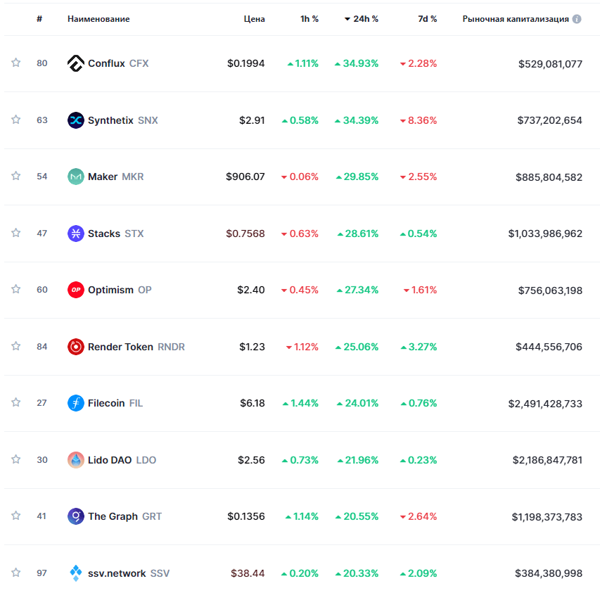 Лидеры роста среди топ-100 за последние сутки. Источник