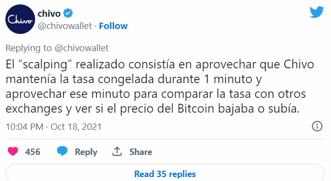 «Скальпинг был доступен потому, что Chivo держал курс криптовалюты в замороженном состоянии в течение одной минуты. Этого хватало, чтобы сравнить цену BTC с данными на других торговых платформах и определить, упала она или выросла». Источник