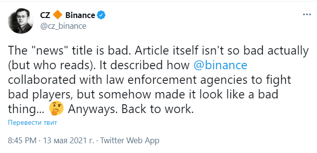 «Заголовок новости плохой, но сама статья не такая уж и негативная. В ней описывается то, как Binance сотрудничает с правоохранительными органами для борьбы с нарушителями закона. Но почему-то эту новость восприняли в негативном ключе», — прокомментировал генеральный директор Binance Чанпен Чжао.