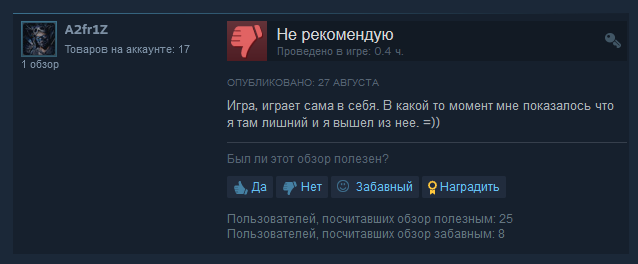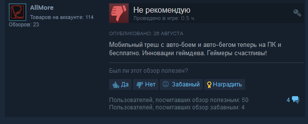 «Мобильный треш с автобоем и автобегом теперь на ПК и бесплатно. Инновации геймдева. Геймеры счастливы!» отметил пользователь с ником AllMore.
