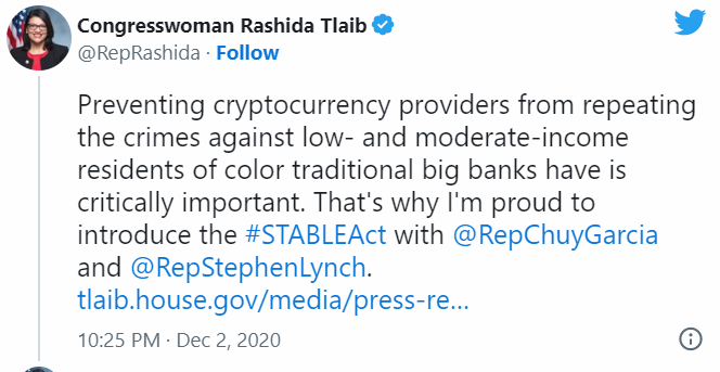 Три представителя партии демократов Рашида Тлаиб (штат Мичиган), Хесус Гарсия (штат Иллинойс) и Стивен Линч (штат Массачусетс) 2 декабря представили законопроект о регулировании стейблкоинов, таких как Diem от Diem Association (ранее Libra от Libra Association)
