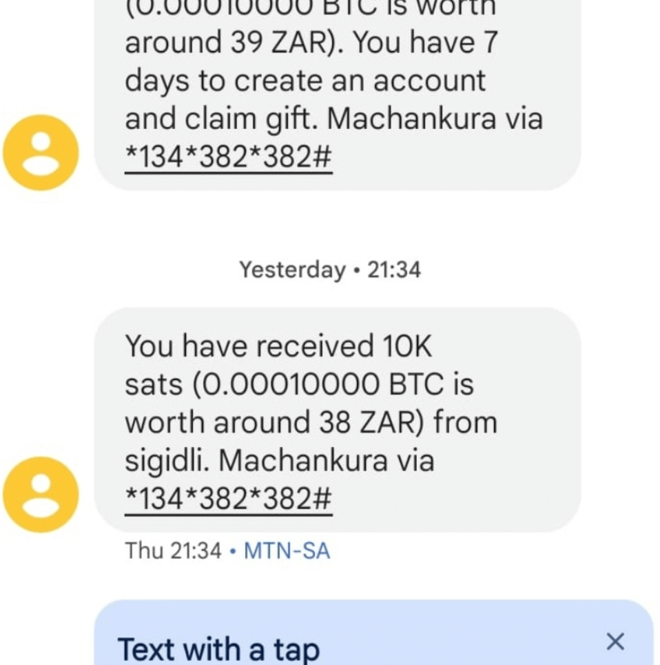 Разработчик Кготатсо Нгако запустил в Южно-Африканской Республике (ЮАР) новый сервис под названием Machankura (в переводе со сленгового означает «деньги»), который позволяет передавать биткоины без доступа к интернету. Для передачи BTC используются СМС-сообщения.