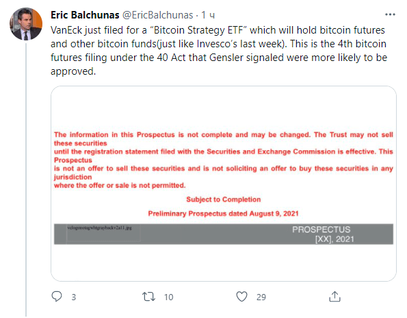 Бальчунас обратил внимание, что это уже четвертая заявка на запуск ETF с использованием фьючерсов на биткоин и закона 1940 года.