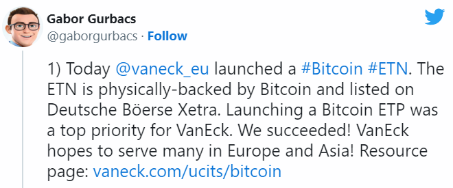 «Сегодня VanEck запускает ETN на биткоин. Инструмент будет торговаться на Deutsche Böerse Xetra. Запуск данного инструмента был главным приоритетом для нас, и мы это сделали». Источник