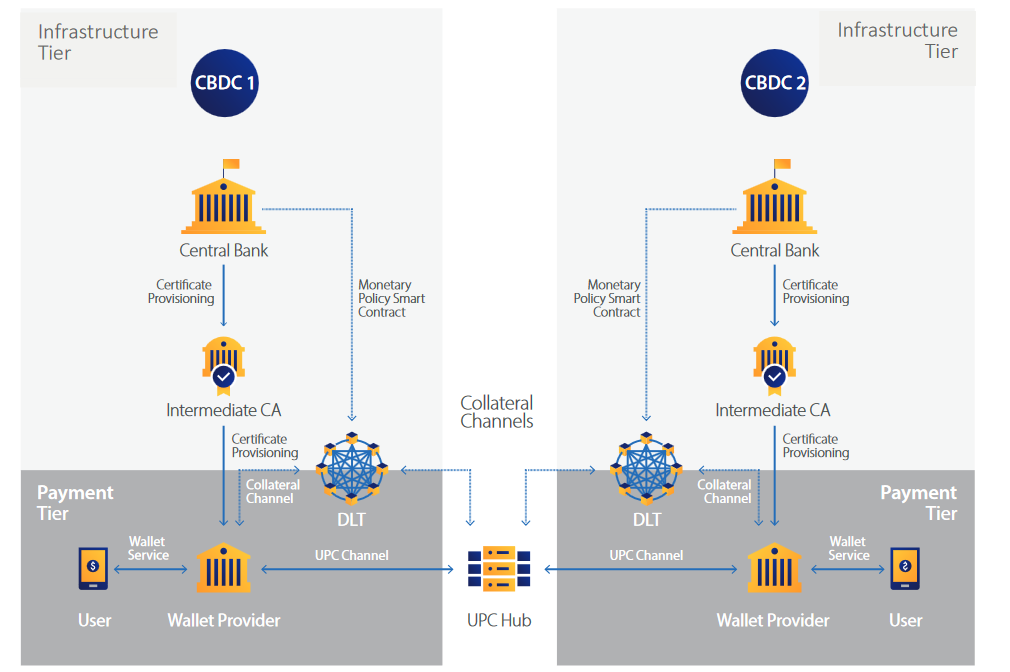 Схема совершения трансграничных платежей в различных CBDC с использованием UPC. Источник.