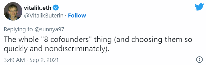 Сооснователь Ethereum Виталик Бутерин сегодня, 2 сентября, провел AMA-сессию, в ходе которой ответил на вопросы людей, на которых он подписан. На вопрос о главных своих сожалениях касаемо запуска Ethereum Виталик назвал выбор сразу 8 соучредителей.