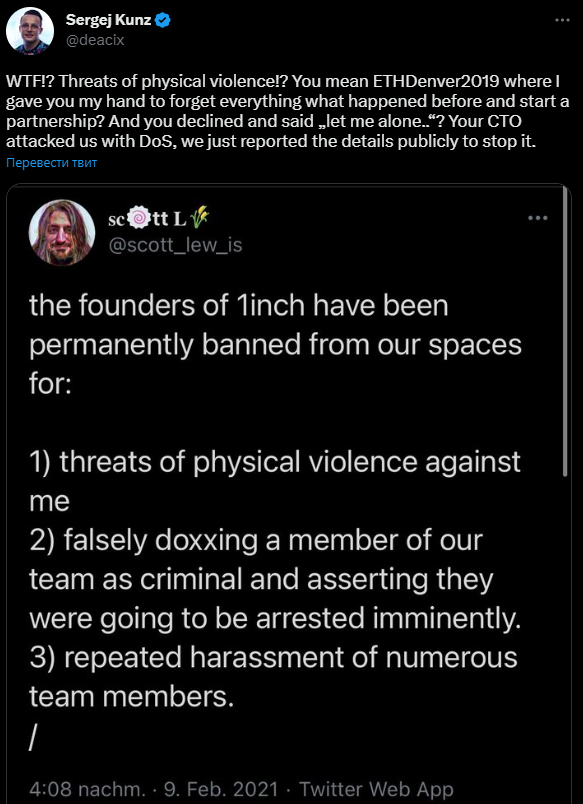 «Какого черта? Физическое насилие? Это вы про тот случай, когда я протянул вам руку и предложил сотрудничать? А вы тогда отказались, попросив оставить вас в покое. Ваш технический директор осуществил DoS-атаку на 1inch, мы рассказали об этом публично, чтобы остановить его». Источник