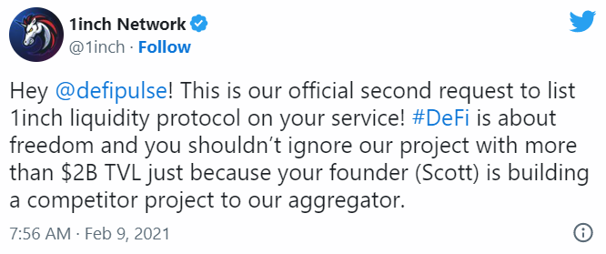«Привет, DeFi Pulse. Мы уже второй раз обращаемся с просьбой добавить 1inch в свой рейтинг. DeFi пропагандирует свободу, поэтому вы не должны игнорировать наш проект с TVL более $2 млрд только потому, что ваш основатель развивает аналогичный продукт». Источник