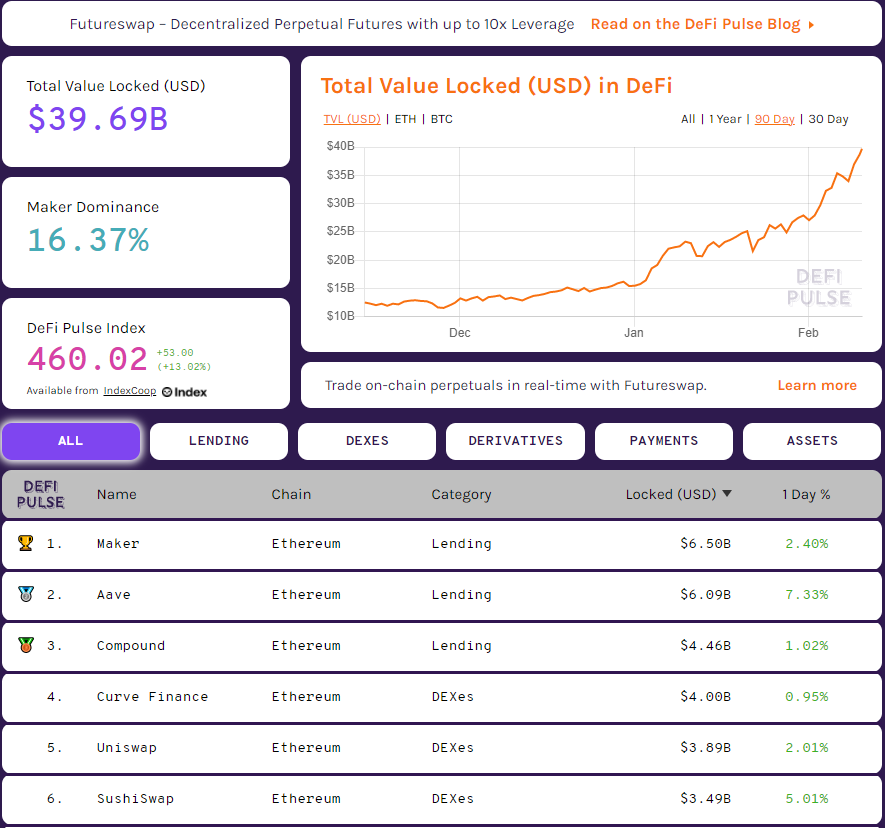 Общая заблокированная стоимость (TVL) в экосистеме DeFi приблизилась к $40 млрд, согласно данным самого популярного сервиса для отслеживания TVL DeFi Pulse.