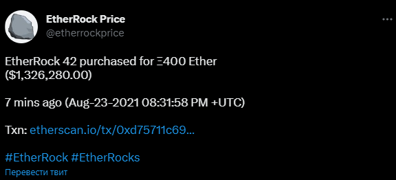 «EtherRock 42 куплен за 400 ETH ($1.3 млн) 7 минут назад». Источник