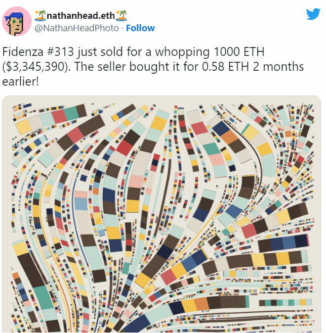 «Fidenza #313 продан за невероятную цену в 1 000 ETH ($3 345 390). Два месяца назад продавец заплатил за эту работу 0.58 ETH!». Источник