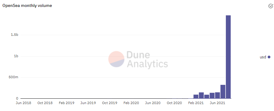 Ежемесячный объем торгов на OpenSea в августе уже приблизился к $2 млрд, что более чем в 5 раз превышает предыдущий рекорд — $325 млн, который был зафиксирован в июле.