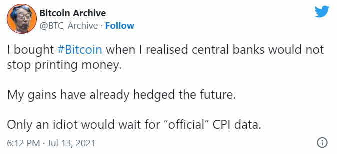 «Я купил биткоин, когда понял, что центробанки не перестанут печатать деньги. Только идиот будет ждать выхода “официальных” данных по ИПЦ». Источник.