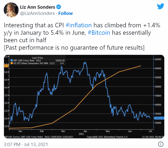 «Интересно, что ИПЦ вырос от 1.4% в январе до 5.4% в июне, однако биткоин падает». Источник.