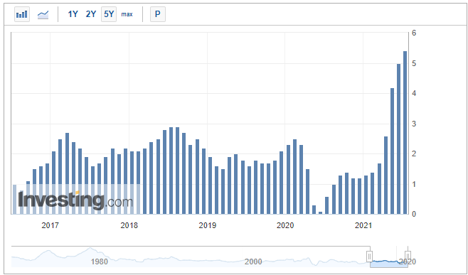В этот вторник, 13 июля, был опубликован индекс потребительских цен (ИПЦ) в США, который отображает изменение цен на товары и услуги. ИПЦ вырос на рекордные за последние 13 лет значения. Всплеск инфляции начался еще в марте, когда индекс потребительских цен вырос на 2.6%. В апреле рост составил 4.2%, в мае — 5%, а в июне — рекордные 5.4%.