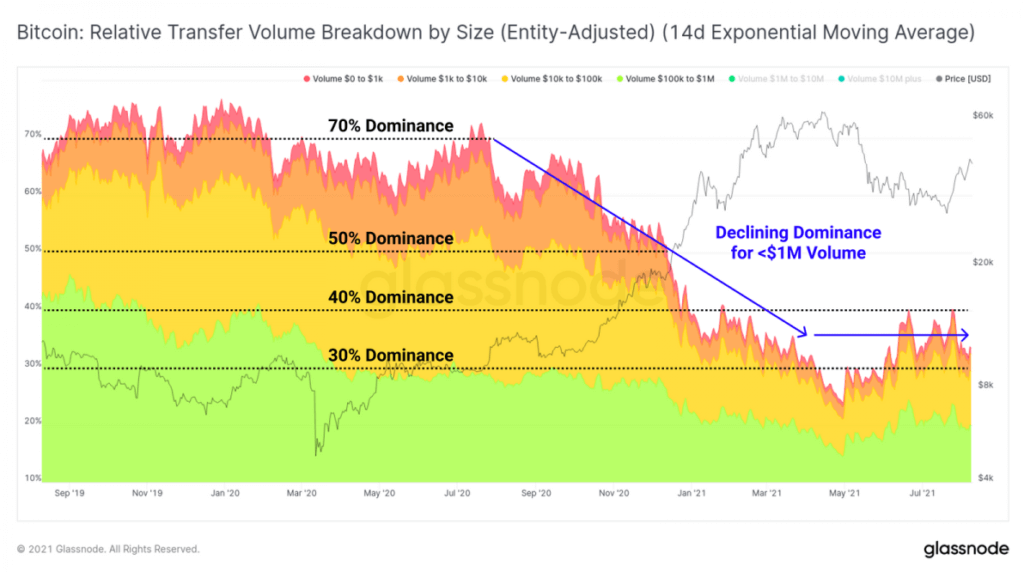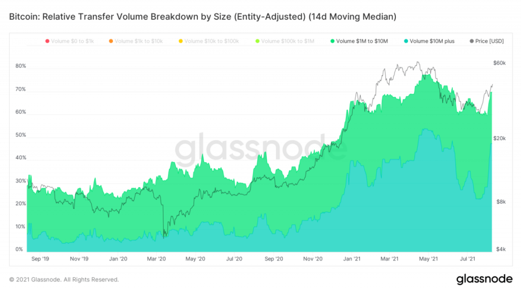 Аналитическая компания Glassnode проанализировала активность в блокчейне Bitcoin и пришла к выводу, что объем транзакций в сети на сумму не менее $1 млн с начала августа вырос на 10%. На данный момент на эти переводы приходятся 70% от общей стоимости всех транзакций в блокчейне.