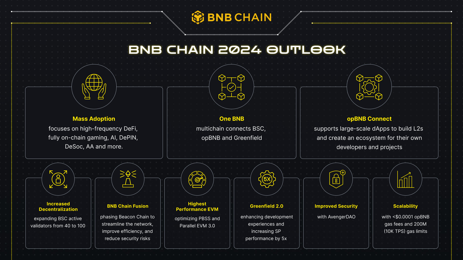 Разработчики BNB Chain представили план по развитию на 2024 год. Планируется развитие новой парадигмы One BNB: связь BNB Smart Chain, opBNB и Greendield в единое решение.