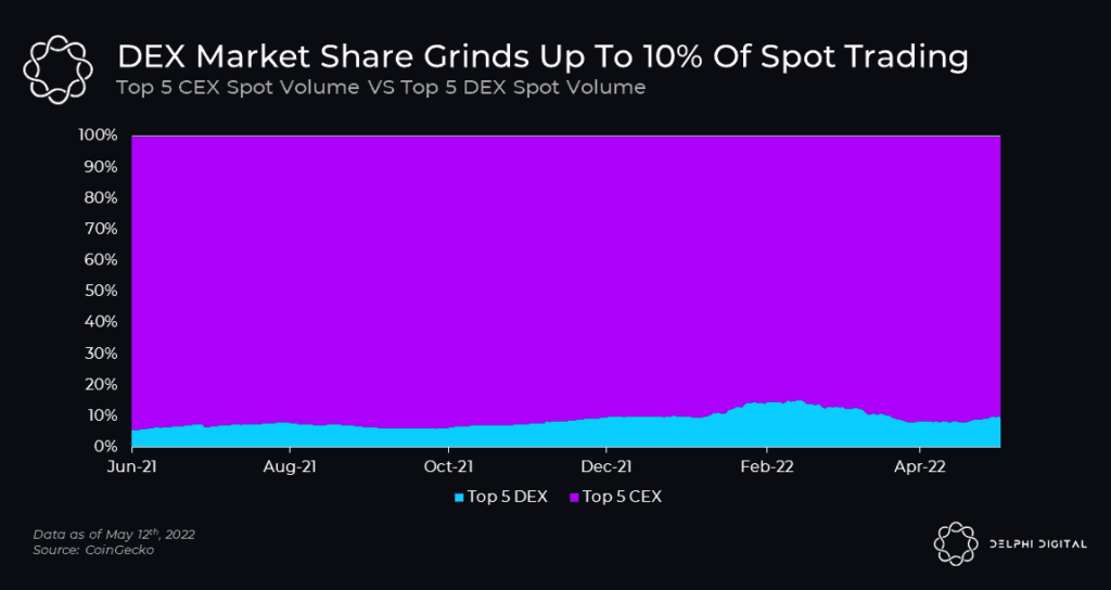 В сравнении с топовыми CEX средний объем суточных торгов деривативами на DEX достаточно низок. Но это предоставляет большие возможности для тех, кто истинно верит в криптовалюты. Чтобы поднять свою долю на рынке на 10% относительно СЕХ, спотовым DEX нужно увеличить объемы торгов в 5 раз.