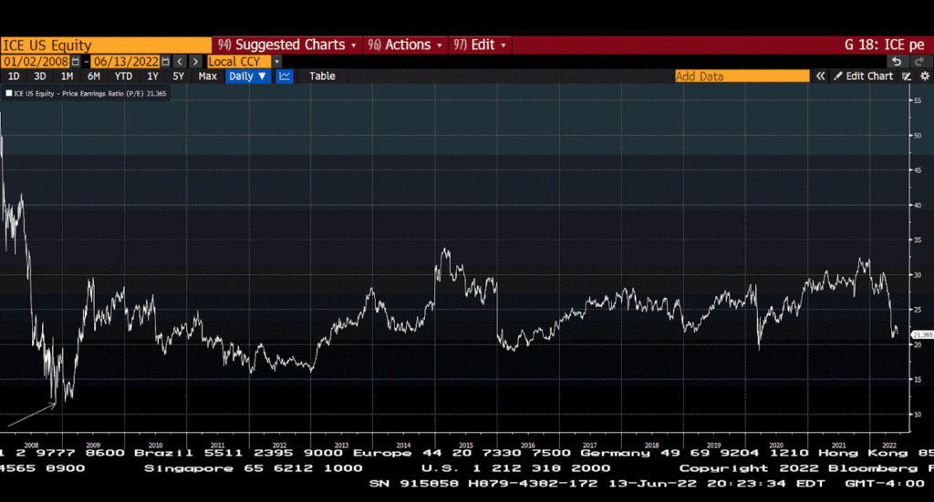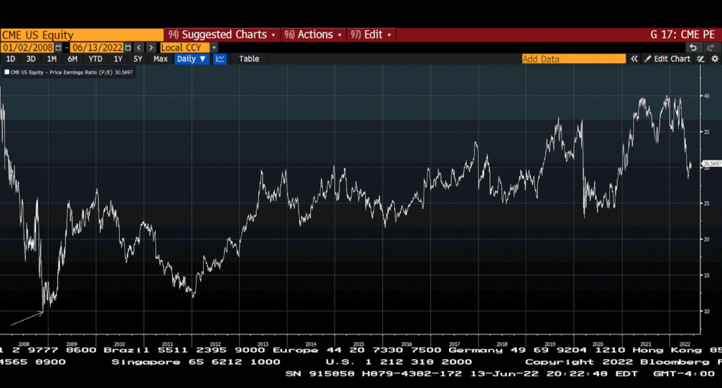 CME и ICE — это две крупнейших в мире биржи по объему среднесуточных торгов. Это отличные бизнесы. Однако обратите внимание на 2008 год. Коэффициент P/E этих бирж находился в районе 10x в начале финансового кризиса, прежде чем рынок восстановился на фоне вливания огромного количества допечатанных ФРС денег.
