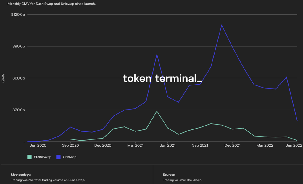 График объема торгов на Uniswap и SushiSwap, которые здесь отмечены как GMV.
