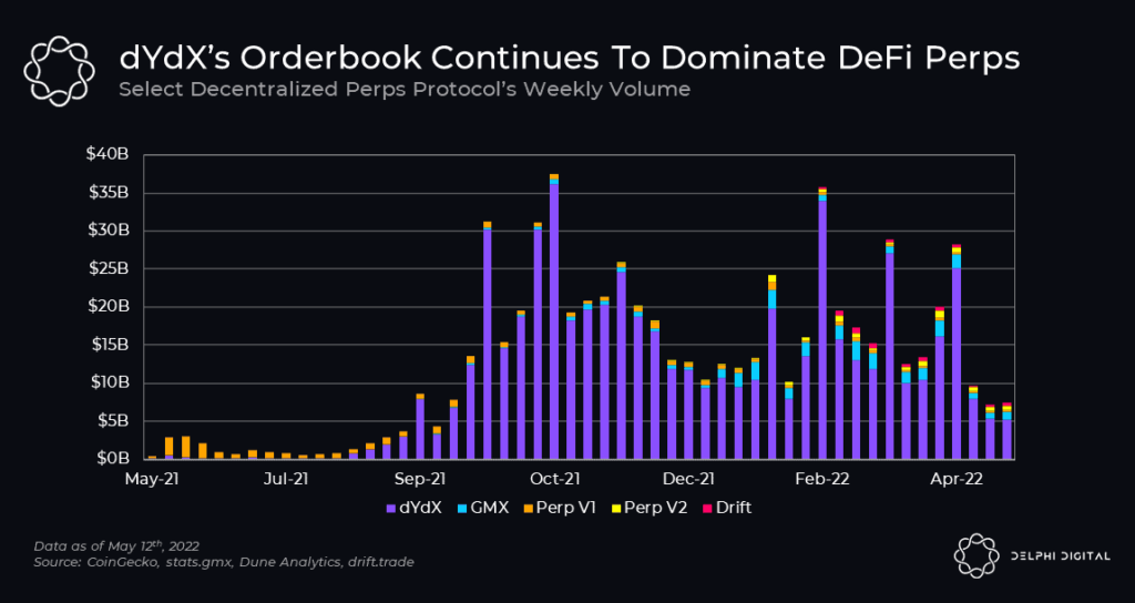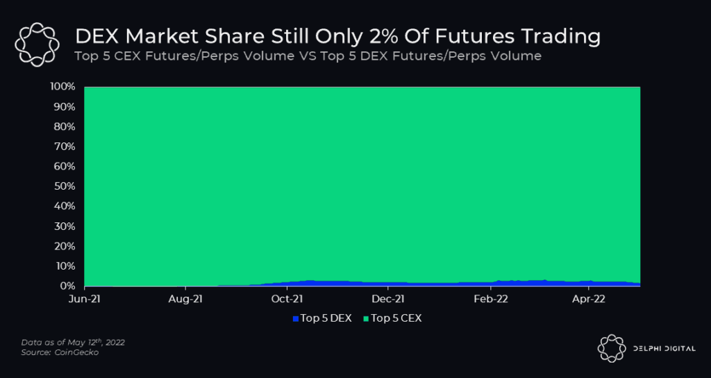 Согласно графику выше от Delphi Digital, доля спот-рынка DEX не такая уж и маленькая. Из года в год этот показатель рос и, я думаю, продолжит расти в будущем по вышеперечисленным причинам. Главная мысль в том, что доминирующие спотовые DEX полезны для небольшой, но растущей группы трейдеров. Несмотря на мощный медвежий рынок, трейдеры все равно будут торговать, а значит, в дальнейшем их ждет все больше торговых комиссий.