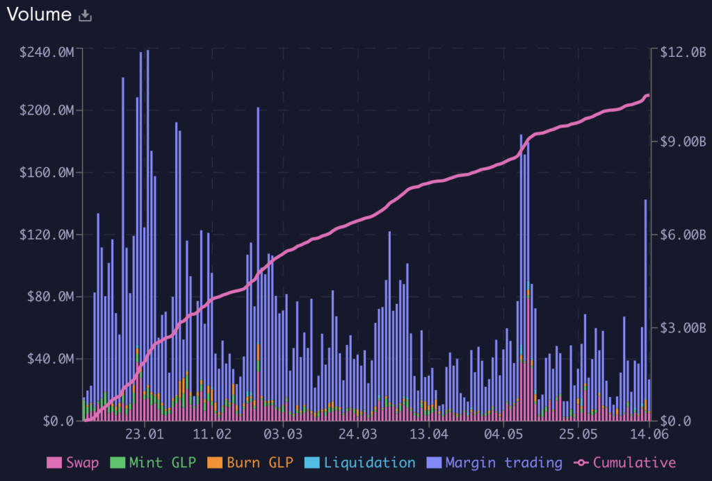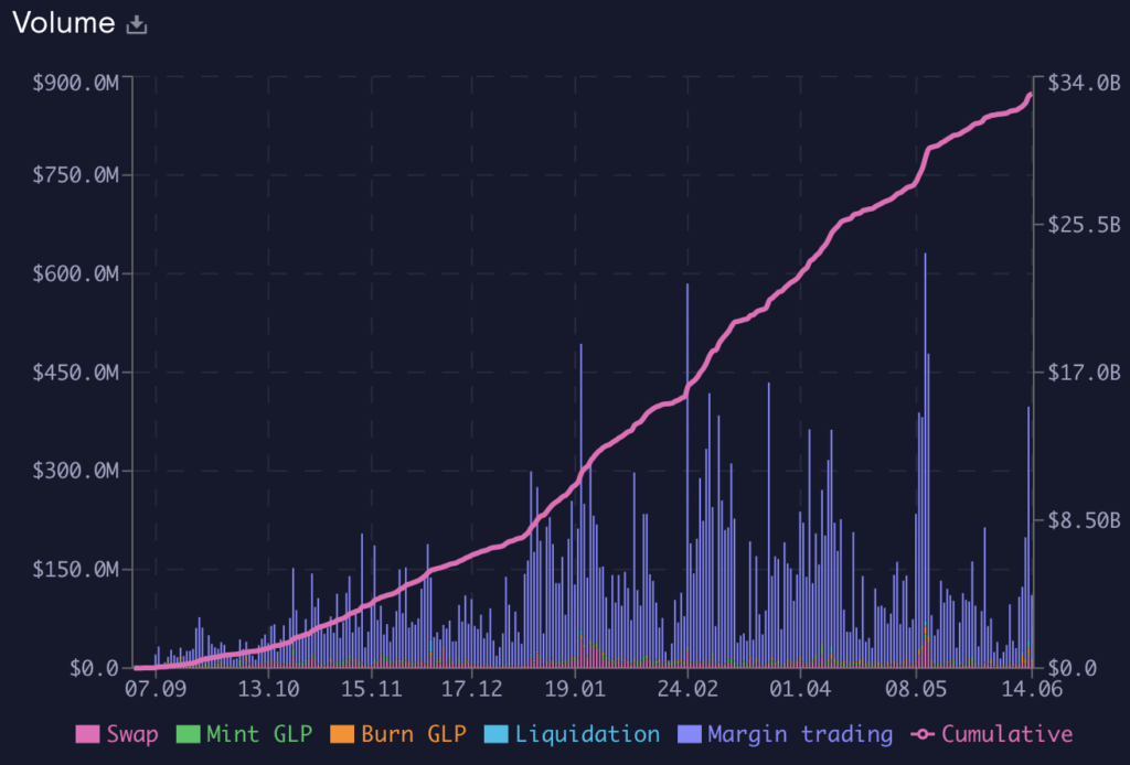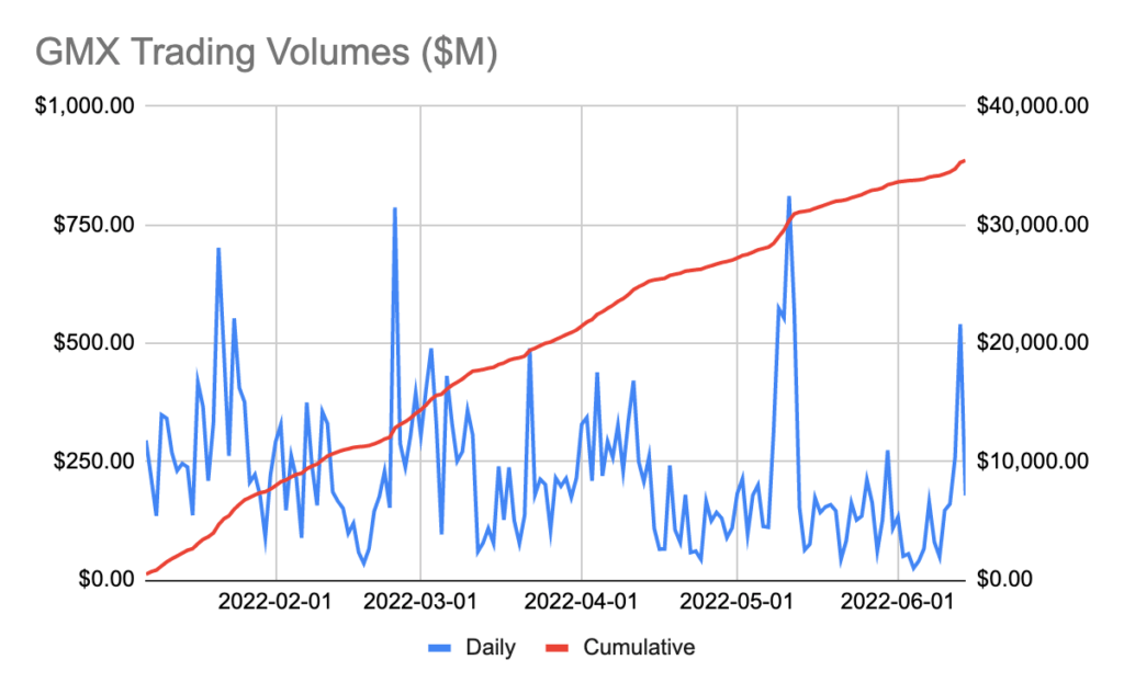 GMX предлагает свопы на совокупный доход (TRS) с псевдо-кредитным плечом на несколько пар криптовалют против фиатных стейблкоинов. По данным от 14 июня 2022 года, в 01:00 утра по Гринвичу объем торгов на GMX с 1 сентября 2021 года составил $33 млрд.