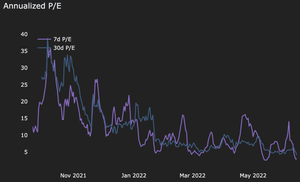 Этот анализ основан на одном предположении. Поскольку каждый из проектов, которые я анализирую, работает на базе Ethereum, я думаю, что со временем число Ethereum-кошельков будет расти в геометрической прогрессии. По этой причине я предполагаю, что общий целевой рынок, который включает в себя эти DeFi-сервисы, также будет расти. В связи с этим я уверен, что DeFi-сектор не умрет, а обратный мыслительный процесс поможет мне понять, какие проекты окажутся привлекательными в сравнении с их прошлой эффективностью. Я также уверен, что общая сумма комиссии этих проектов будет расти даже в непродолжительные периоды низкой активности и доходов или даже при полной стагнации из-за медвежьего рынка. Для этих проектов я использовал сервис Token Terminal, чтобы построить график мультипликаторов Price-to-Earnings (P/E).