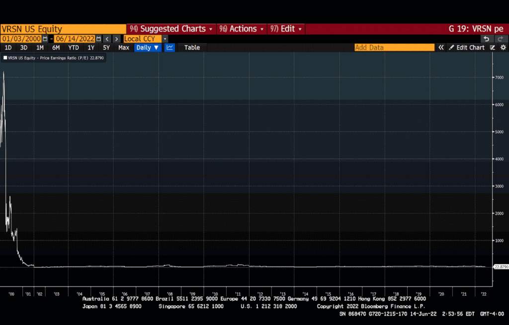 Конкурент ENS из мира Web2 — это Verisign. Это один из крупнейших поставщиков DNS для традиционных веб-сайтов. Компания работает на рынке со времен пузыря доткомов 2000-х годов и тогда торговалась по астрономически высокому коэффициенту P/E.