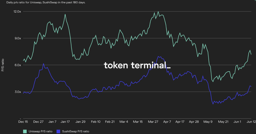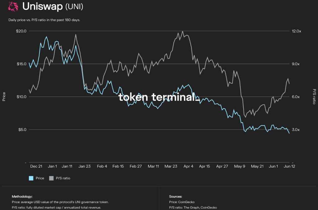 Сейчас Uniswap полностью распределяет комиссии между поставщиками ликвидности. Предполагаю, скоро держатели токенов управления проголосуют за то, чтобы часть комиссий также распределялась и между ними. Вот почему на графике выше также представлен коэффициент цены к объему продаж (P/S), а не коэффициент P/E.